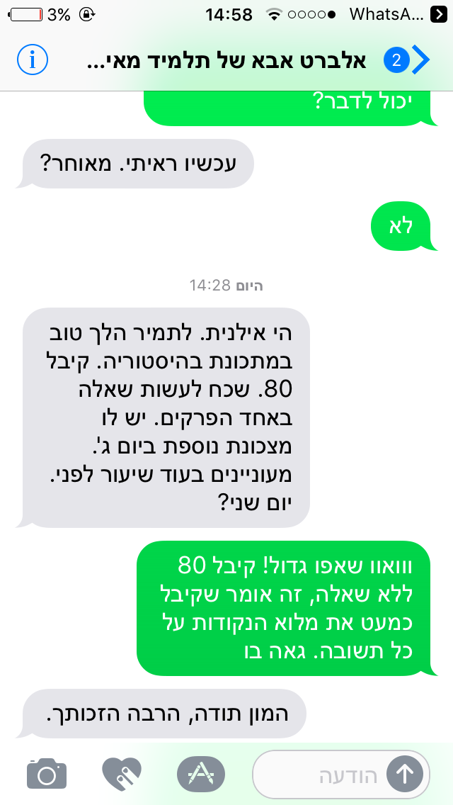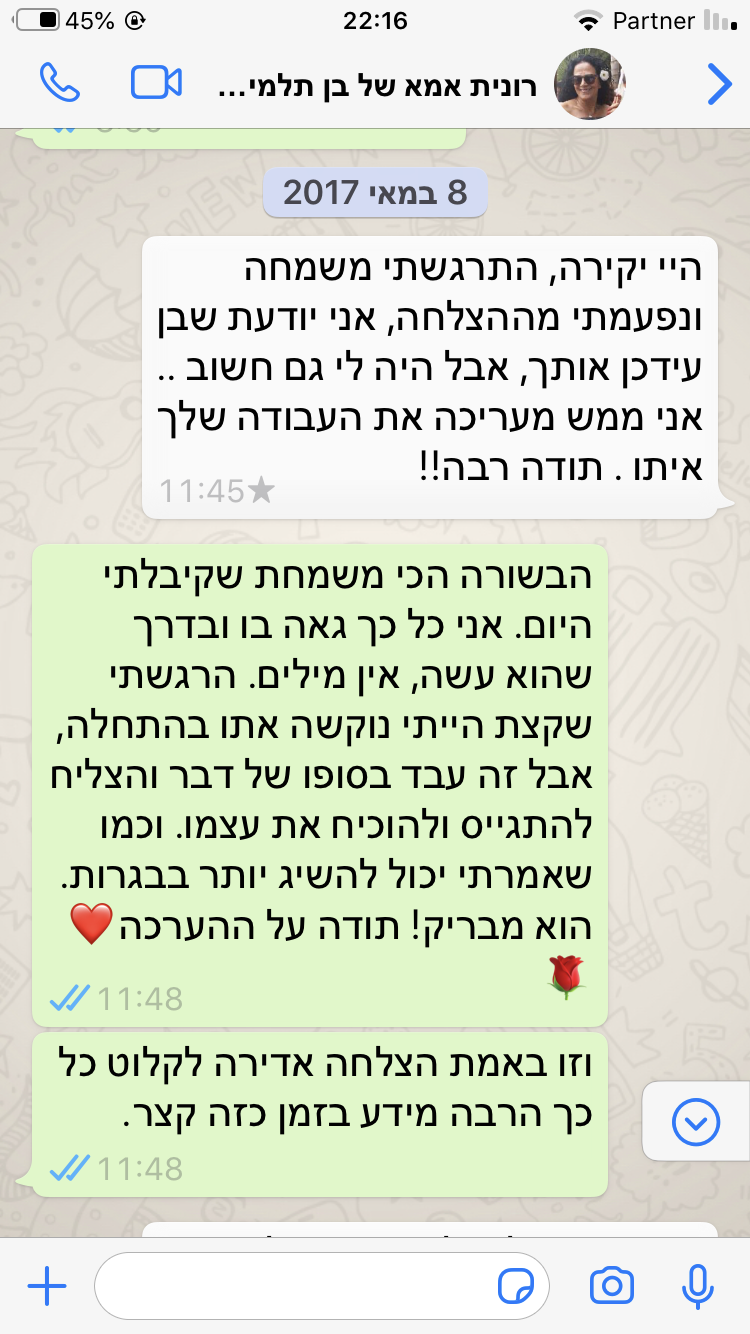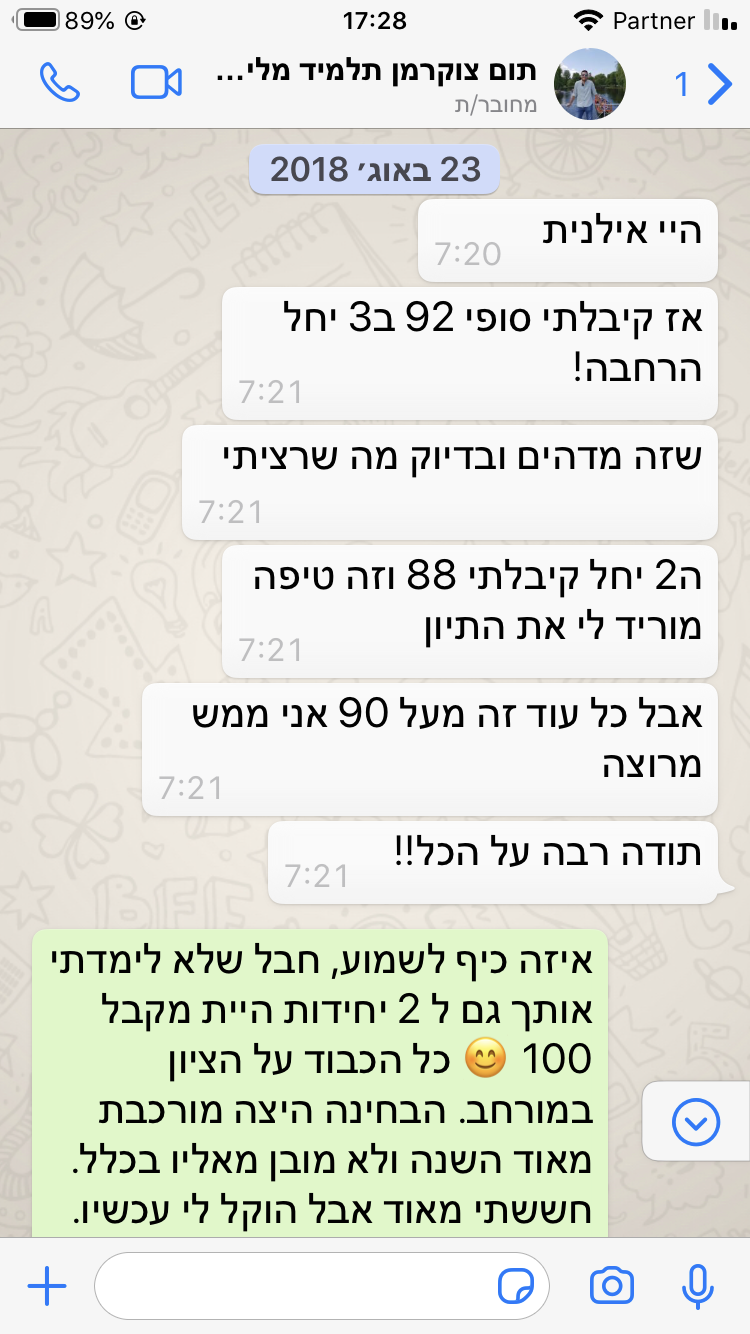 אני רוצה להודות מעומק הלב לאילנית, מורה מעולה מקצועית ורגישה שהצליחה ללמד את בני והכינה אותו לבגרות במקצועות ספרות ותנך. אילנית מורה מקצועית ביותר, יודעת למקד את החומר ולהעביר אותו בצורה נגישה ומעניינת, תמיד זמינה לכל שאלה, מבינה איך לגשת אל התלמידים שלה ולחזק את מקורות הכוח. מורה נדירה! ההישגים של בני מוכיחים את עצמם! ממליצה לכל מי שמעוניין להצליח בגדול. תודה רבה!
